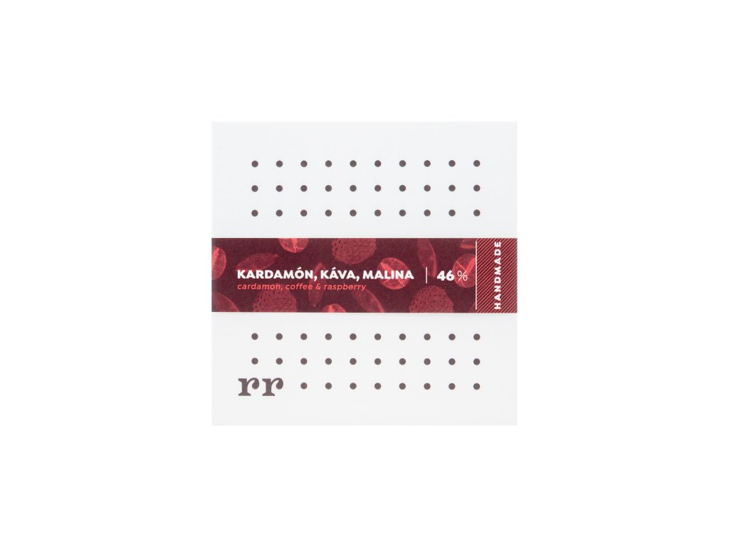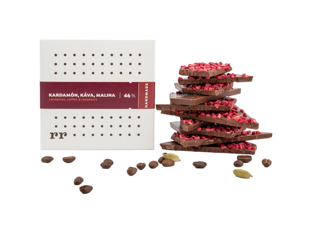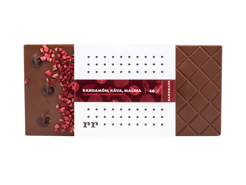 Kardamón, káva, lyofilizovaná malina a výborná mliečna čokoláda.