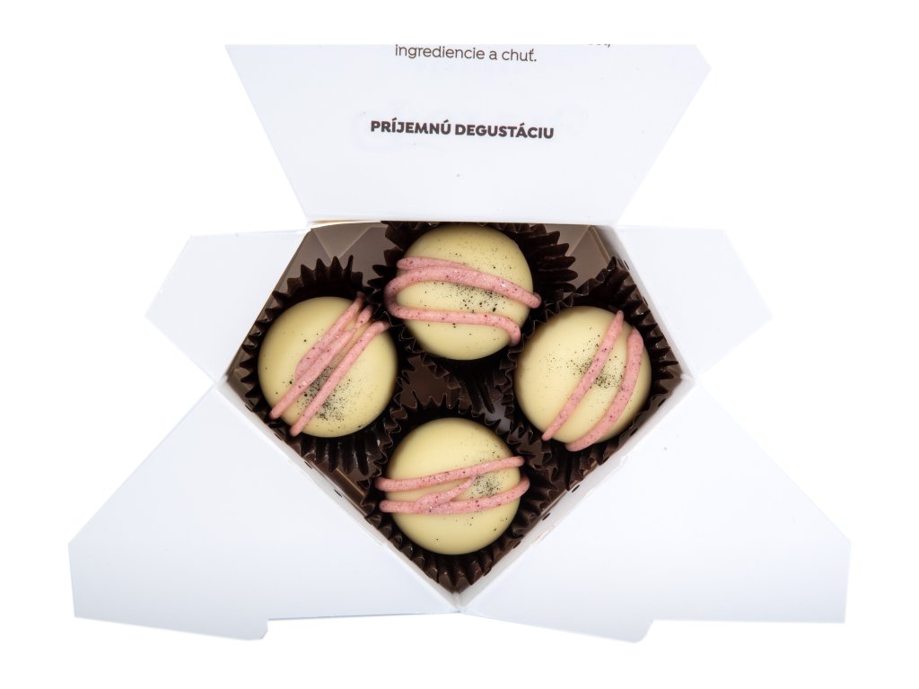 Pralinky v bielej čokoláde s náplňou MAK-ČUČORIEDKA. Obsah kakaového masla minimálne 43%.
