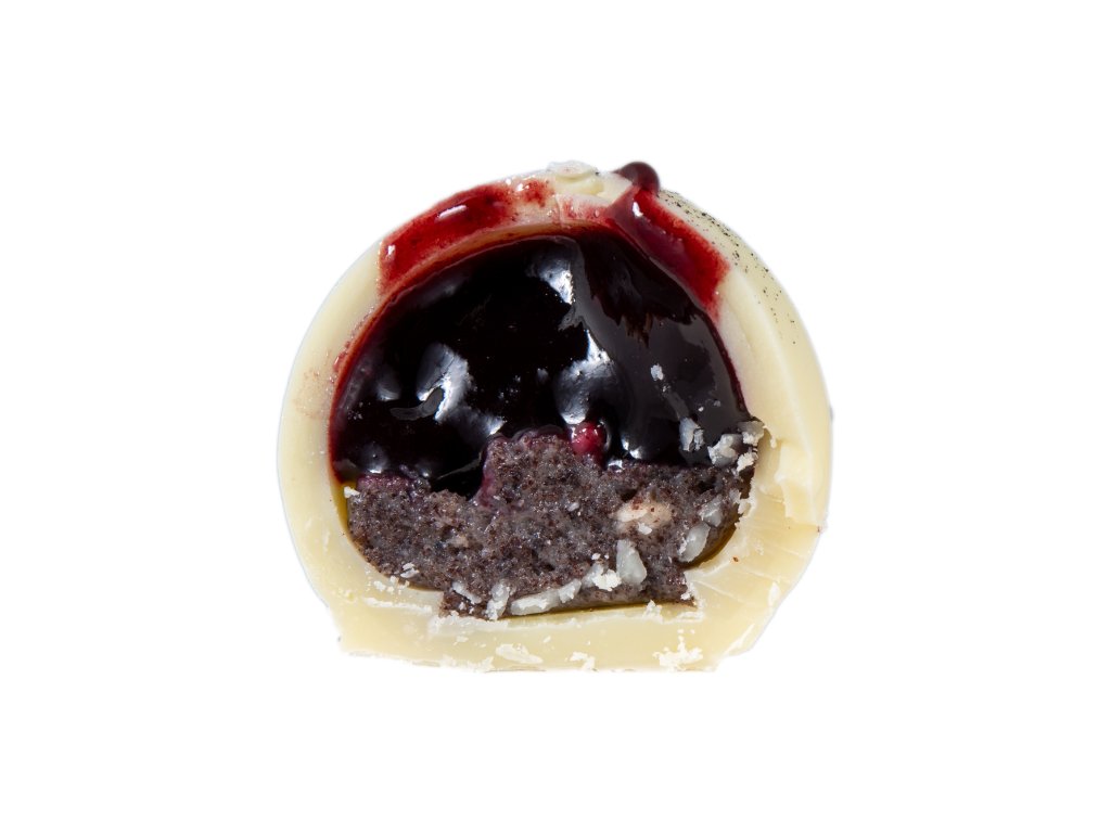 Zloženie: biela čokoláda (kakaové maslo, cukor, sušené mlieko, sójový lecitín bez GMO, vanilkový extrakt), náplň: maková fáza (smotana, mak, biela čokoláda, makový olej, ryžové pukance), čučoriedková fáza (čučoriedkové pyré, sorbitol, pektín, invertný cukor, glukóza), ozdoba: biela čokoláda zafarbená cviklovým prachom, potravinársky uhlík E 153.