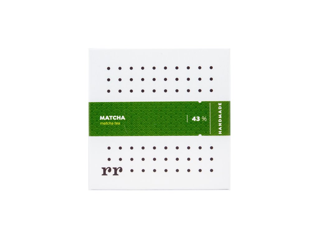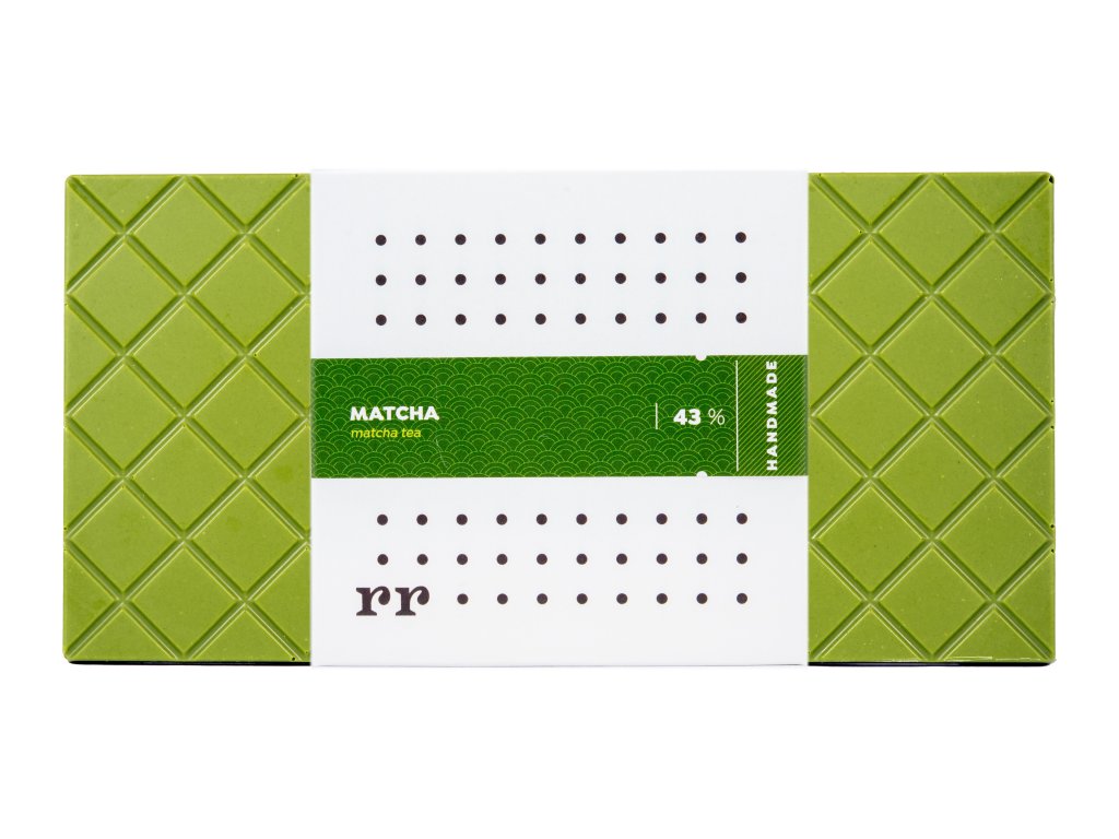 Biela čokoláda s Matcha práškom. Kakaové maslo v bielej čokoláde najmenej 43%.