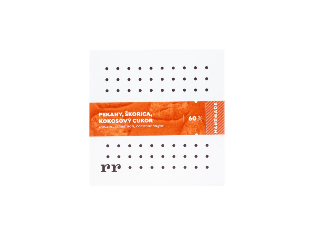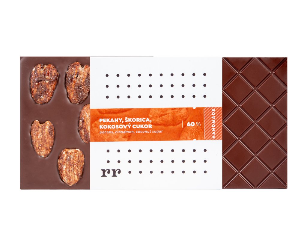 Horká čokoláda sladená kokosovým cukrom s pekanovými orechmi obalenými v škorici. Obsah kakaovej hmoty minimálne 60%.