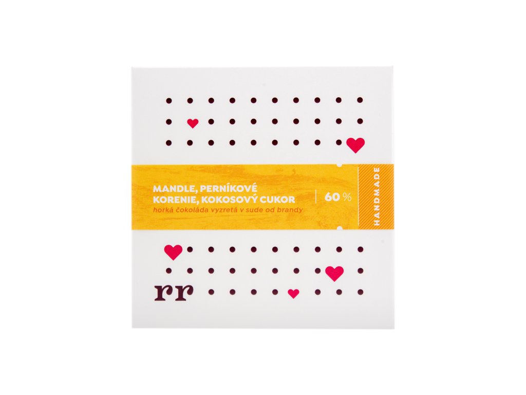 Zloženie: horká čokoláda ( kakaová hmota, kokosový cukor, kakaové maslo, inulín), mandle v perníkovom korení 25 % ( mandle 76%, cukor 20,5%, perníkové korenie 3,5% ( škorica, aníz, koriander, kardamóm, zázvor).